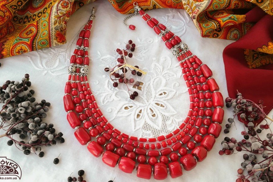 Традиційне українське намисто з коралів — це, як правило, кілька рядів намистин, що переходять від малих до більших. Задля естетики їх часто доповнювали золотими або срібними елементами. У західній частині України до прикрас часто додавали дукачі — металеві підвіски, що робили образ ще більш розкішним.