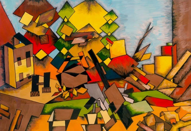 - Багатоплановість: Об’єкти зображуються з різних точок зору, що створює ефект розбитого простору.